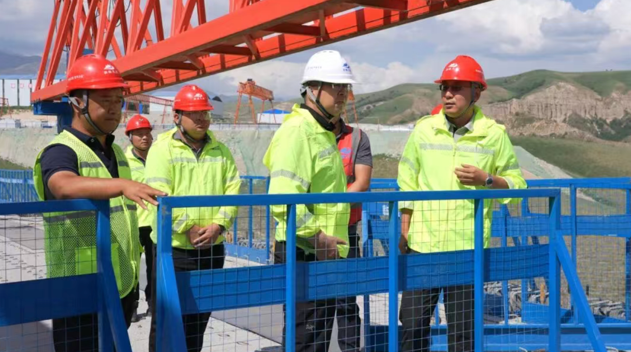 图为新疆交投集团董事会秘书,交建股份党委书记、董事长王彤在项目大桥听取建设情况汇报