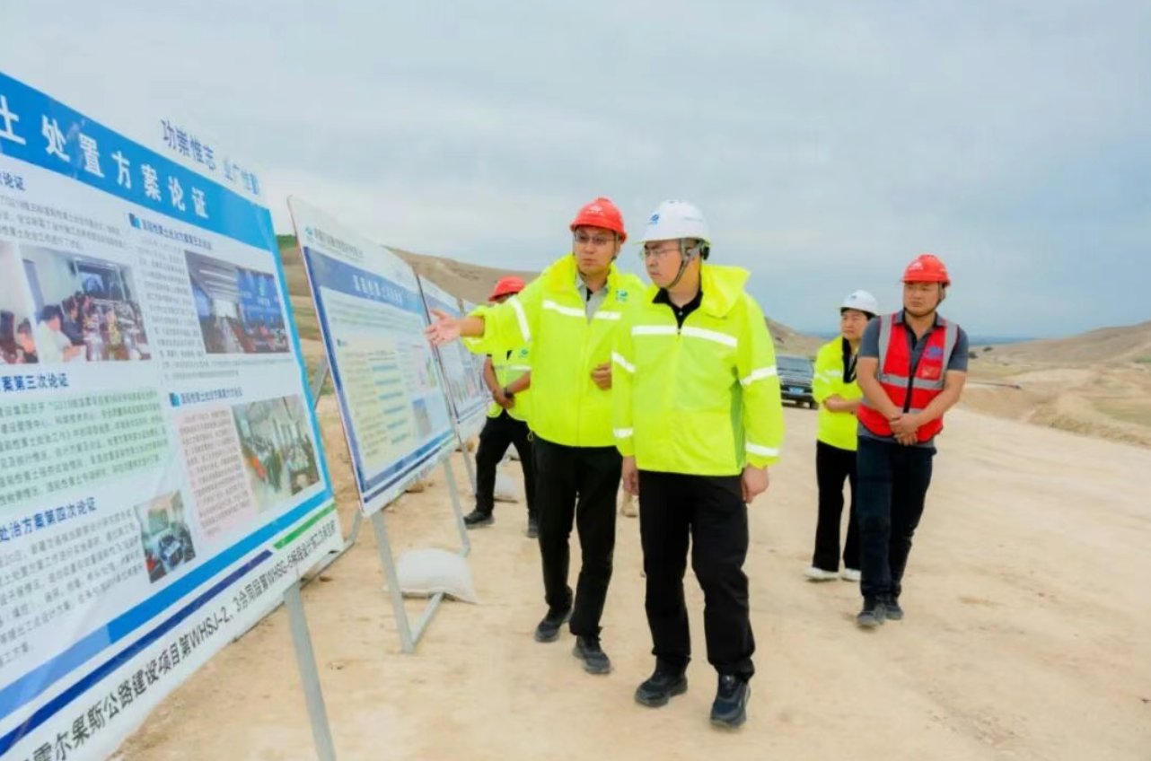 图为新疆交投集团董事会秘书,交建股份党委书记、董事长王彤在项目施工现场听取温霍项目湿陷性黄土处置情况汇报 在项目现场,调研组听取察看了施工情况,就70m高墩桥、40m深挖路堑,湿陷性黄土特殊路基等重难点控制型工程存在问题同相关单位进行了协调沟通。并对项目团队在克服施工空间受限、便道纵坡大运输困难、征地拆迁区域复杂、料源紧缺等困难问题上展现出的主动破题、务实敢干的精气神表示了肯定。 在项目驻地,调研组察看了驻地建设,并同干部职工交流座谈和开展送清凉慰问。