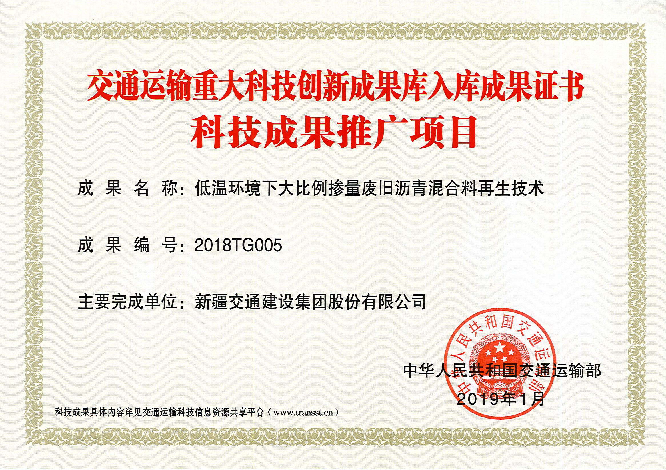 《低温环境下大比例掺量废旧沥青混合料再生技术》交通运输建设科技成果推广