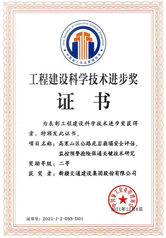《天山公路边坡地质灾害预测评价方法与防治技术研究》自治区科技进步一等奖