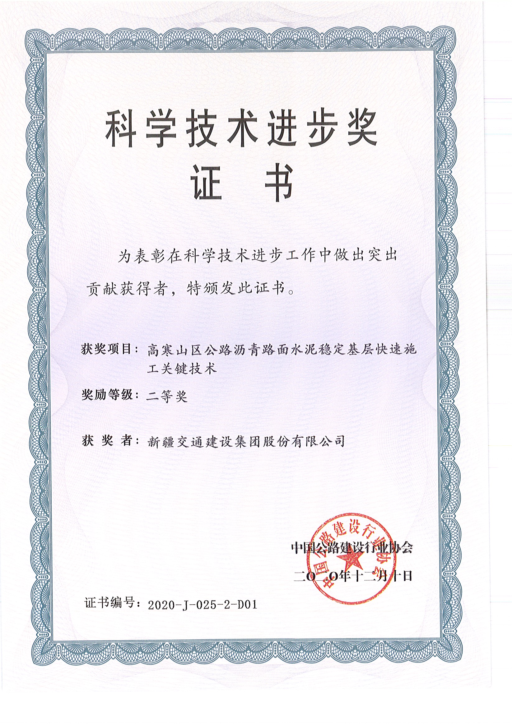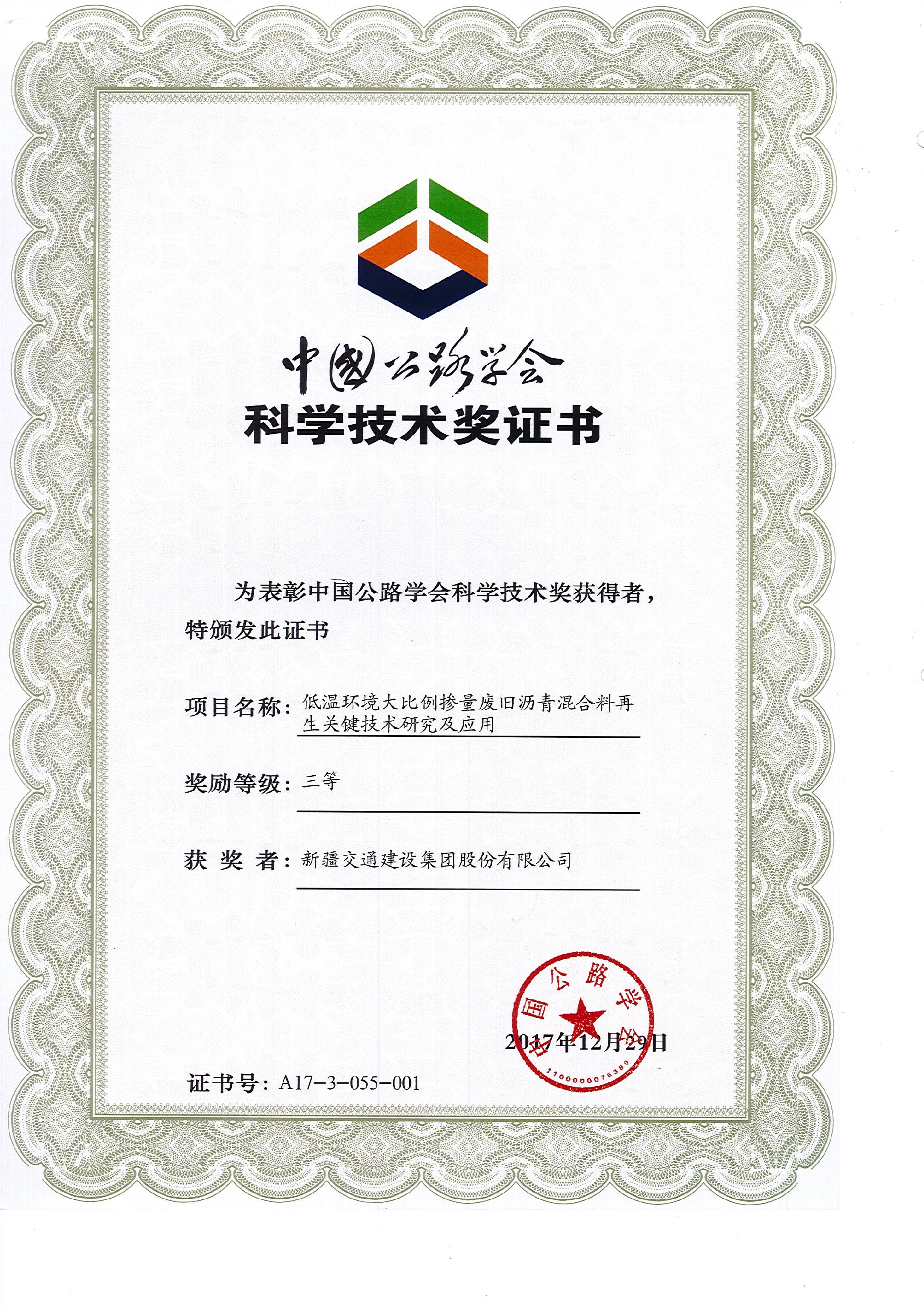 《低温环境大比例掺量废旧沥青混合料再生关键技术研究及应用》中国公路学会科学技术三等奖