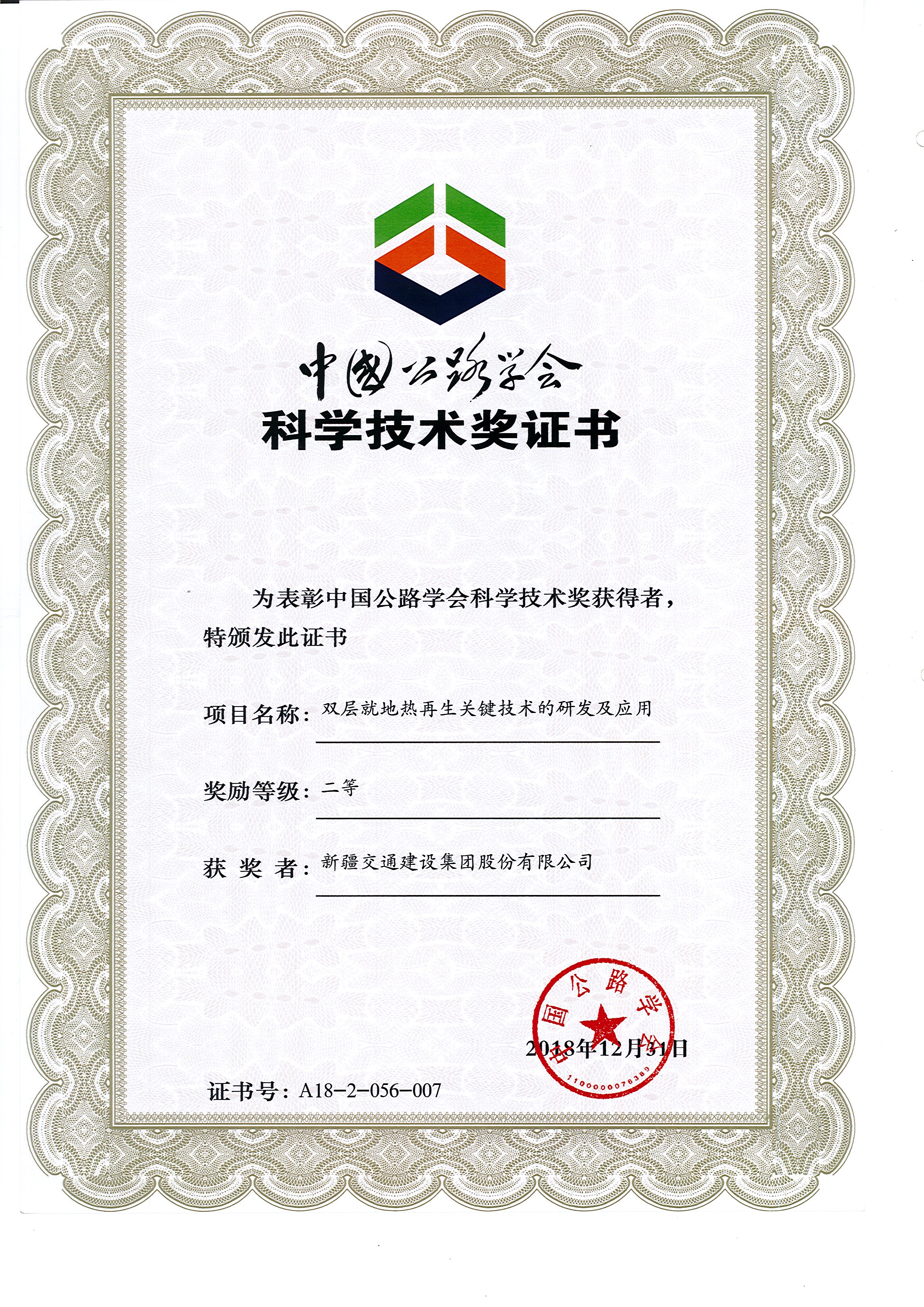 《双层就地热再生关键技术的研究及应用》中国公路学会科学技术奖二等奖