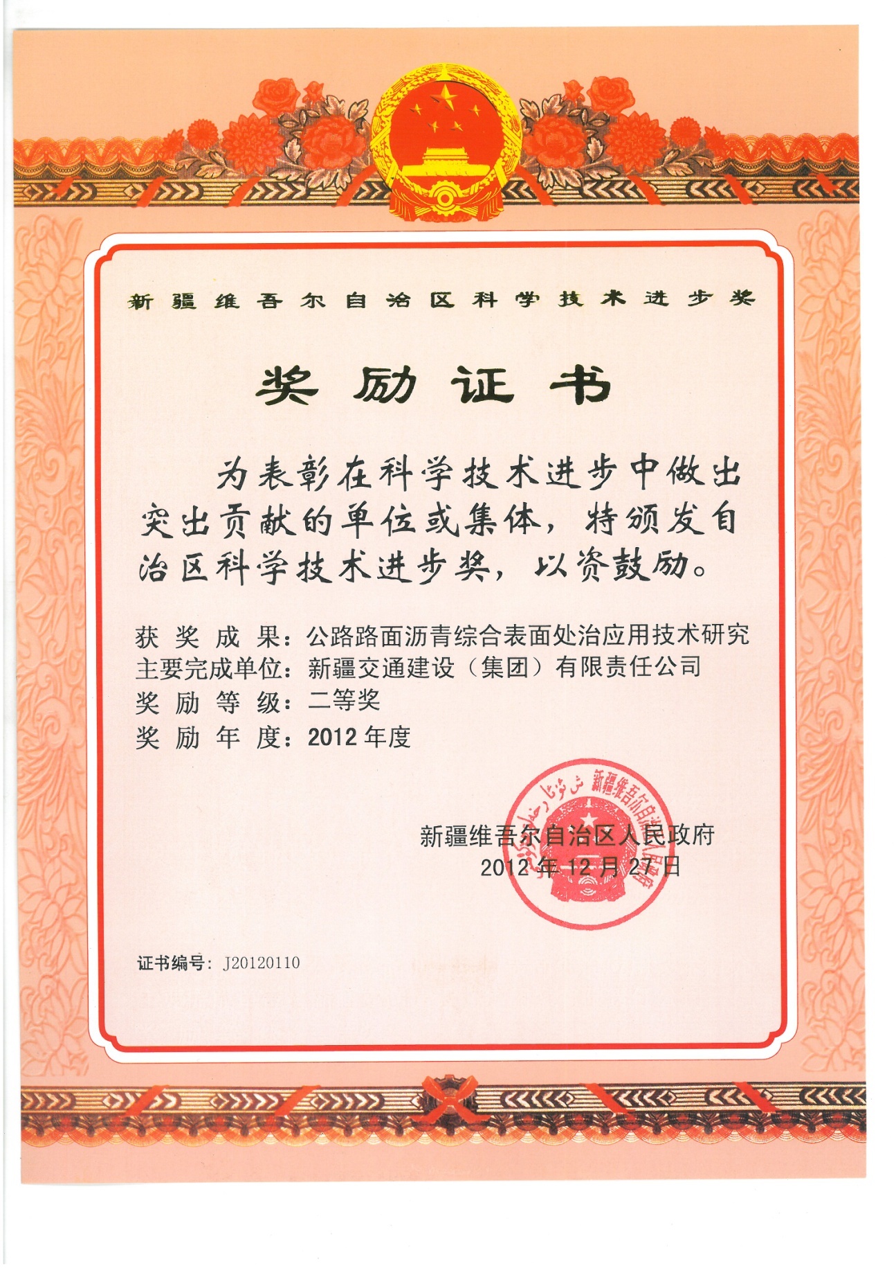 《公路路面沥青综合表面处治应用技术研究》自治区科技进步二等奖