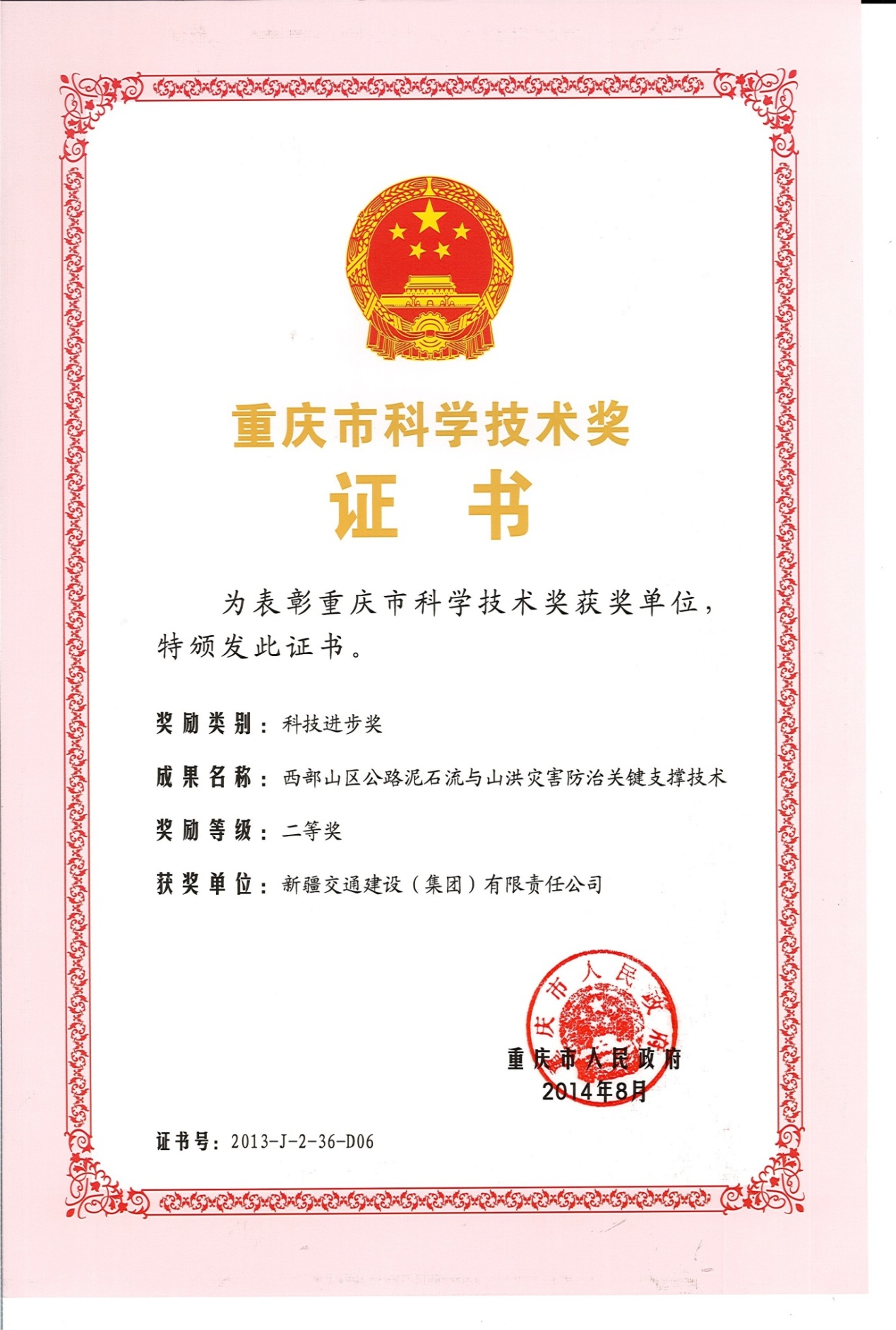 《西部山区公路泥石流与山洪灾害防治关键支撑技术》重庆市科技进步二等奖